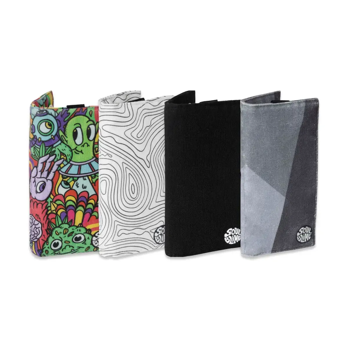 Ranura abierta para papelillos, bolsillo abierto para bolsa de tabaco, bolsillo con cierre para filtros u otros y mosquetón.